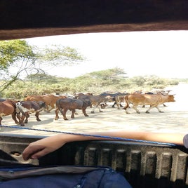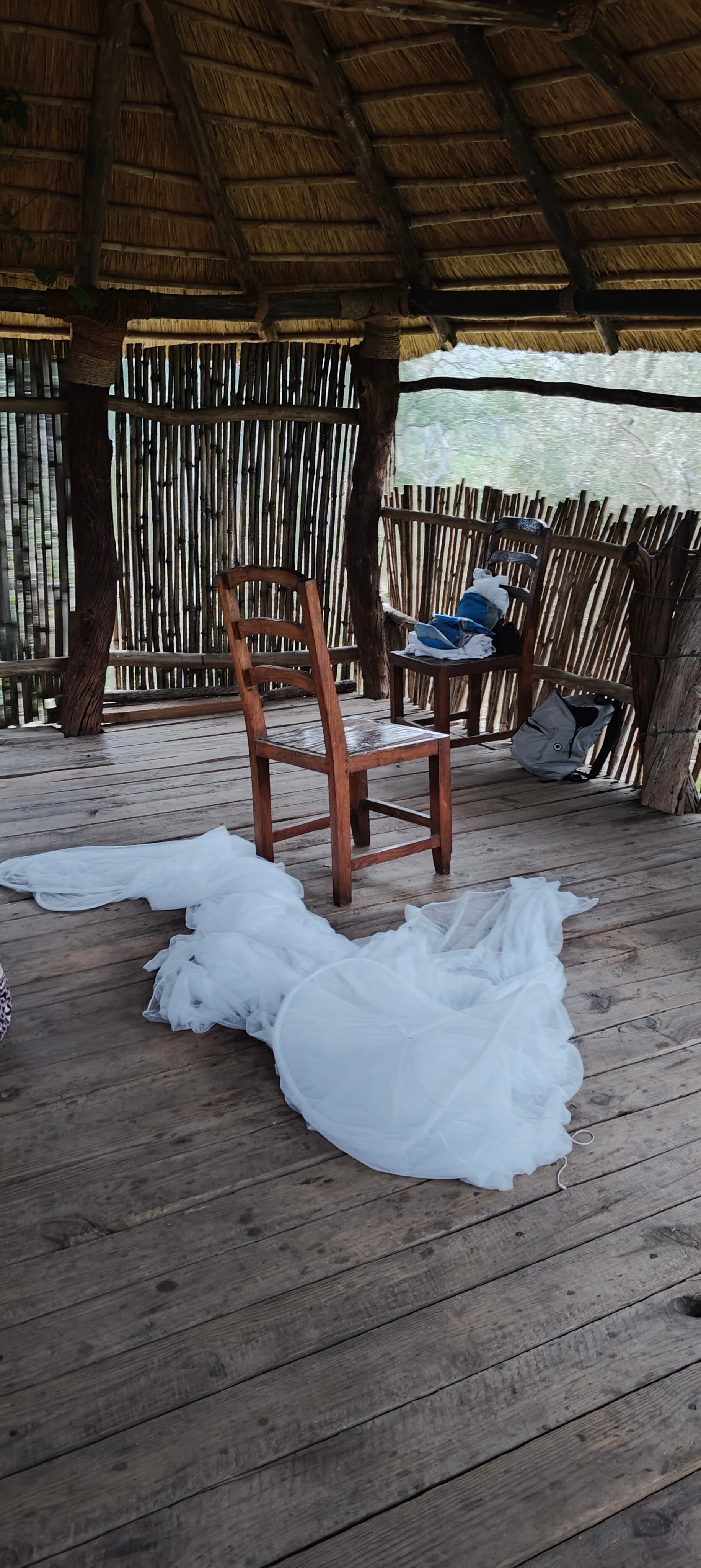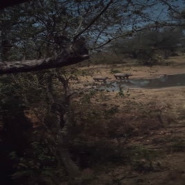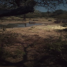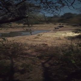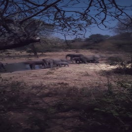 Er zijn ook uitkijkpunten waar je vanaf een hoogte kunt kijken naar de dieren, in plaats van vanuit de auto. Deze simpele plek, bleek eveneens de plaats waar we zouden overnachten… toen dacht ik wel even “oei… er is hier helemaal niets” We moesten matrassen en klamboes halen en lagen op de grond van de uitkijkplaats. Geen kraan, geen toilet, gewoon een houten hutje op palen met een trap. Van zonsondergang (18.00 uur) tot zonsopkomst (6 uur) mochten we die plaats niet meer verlaten. En dus maakte in kennis met een nieuwe ervaring/kunst: wildplassen vanaf een trap! Ook best leuk om eens mee te maken. Die avond staarden we uren in het donker in de hoop dat de dieren bij de bron kwamen drinken. Na een tijdje kwam er een grote groep buffels, maar we hoopten het meest op de neushoorn. Deze wordt bij daglicht bijna nooit waargenomen en sowieso niet vaak gezien. Ineens werd de groep buffels opgeschrikt door geluid uit de bosjes en namen zowaar 4 neushoorns plaats in. We hadden geen goed fototoestel mee, maar gelukkig wel telefoons waarbij we de sluitertijd konden aanpassen 😊 en zo kregen we na lang priegelen toch nog de schrikachtige neushoorns wazig op de foto.