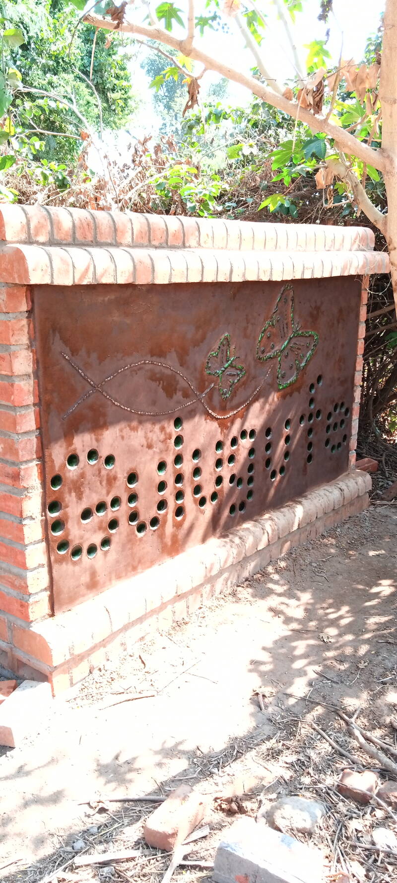 Modder, flesjes en mozaïek van glas, waren de ingrediënten voor dit ontzettend leuke project en het resultaat mag er zijn! ( alleen moet de muur nog wat lichter worden en de boom nog gekapt..)